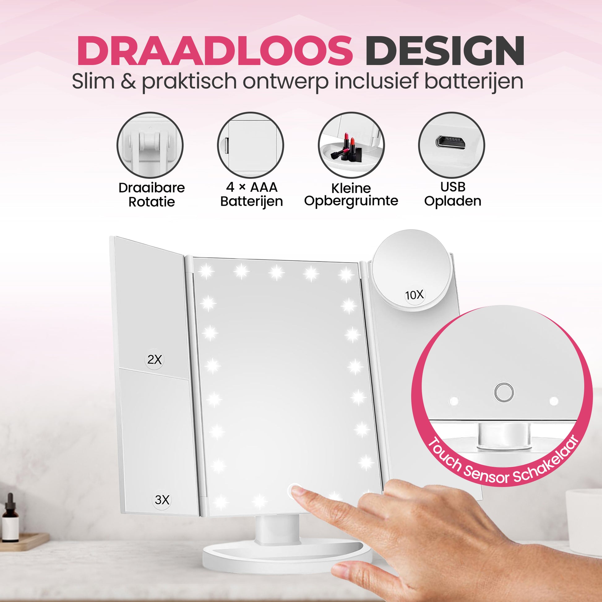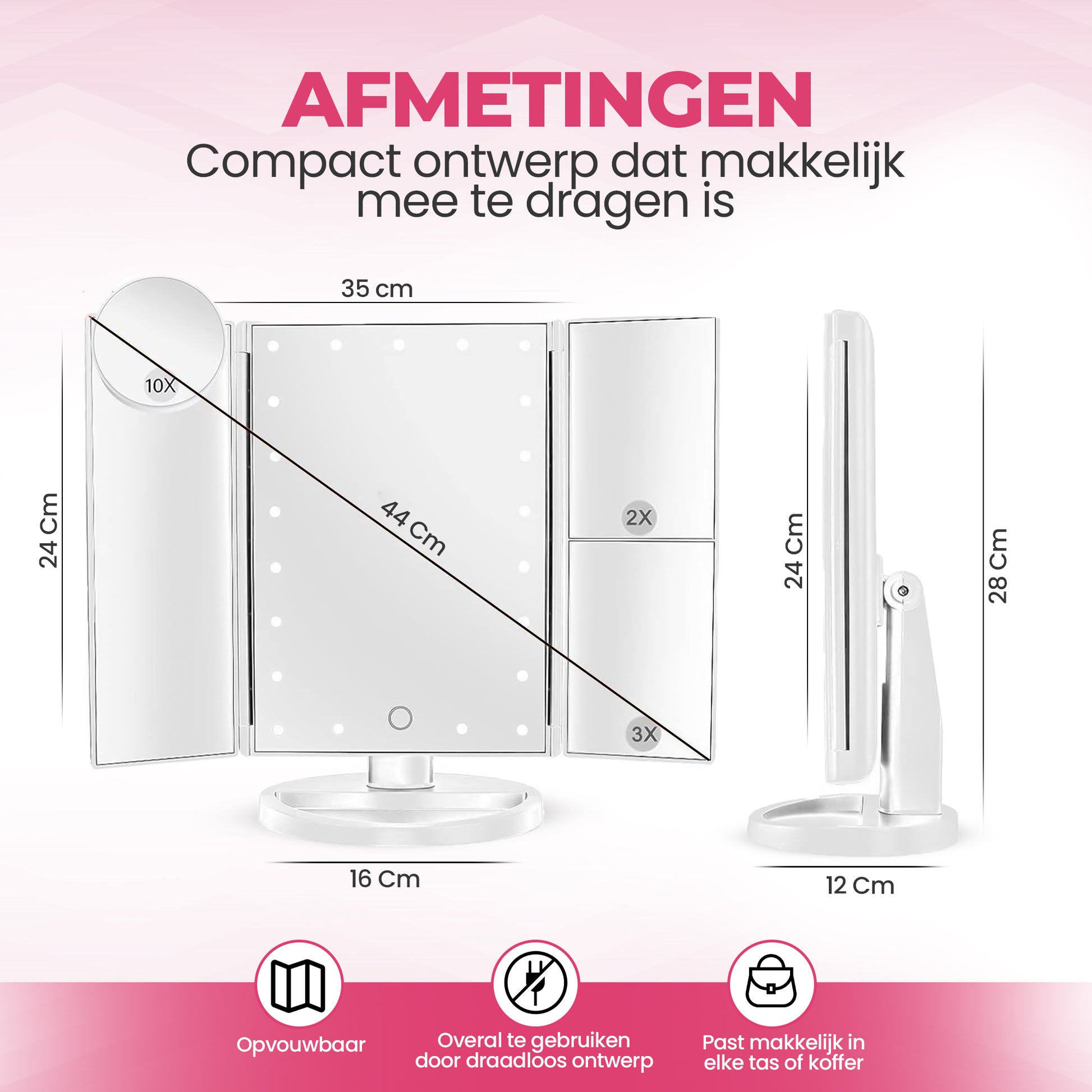 De spiegel beschikt over drie verschillende vergrotingen (10x, 3x en 2x) waarmee je elk detail van je gezicht haarscherp kunt zien. Perfect voor het epileren van wenkbrauwen, het aanbrengen van eyeliner of het checken van je huid. Dankzij het trifold ontwerp kun je van meerdere hoeken kijken en heb je altijd een volledig overzicht van je gezicht. Let op: de hoofdspiegel is zonder vergroting, de zijkanten bieden de close-ups.