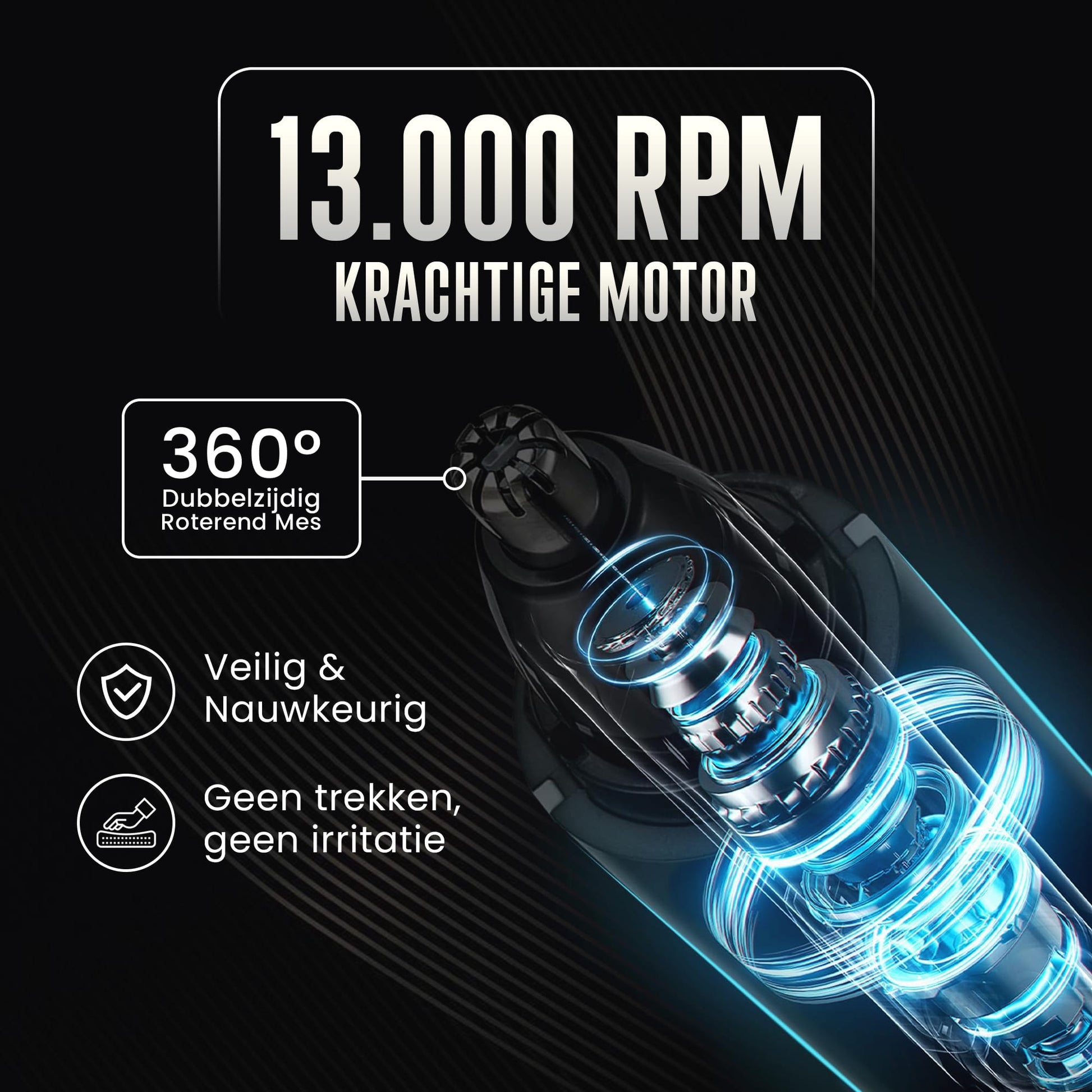 De krachtige motor van 13.000 RPM in combinatie met het dubbelzijdige 360° roterende mes zorgt voor een nauwkeurige, maar zachte trimbeurt. De mesjes zijn speciaal ontworpen om netjes in de neus of oren te passen zonder te trekken aan haartjes of schade te veroorzaken. Het resultaat? Een pijnloze ervaring, zelfs op gevoelige plekken.