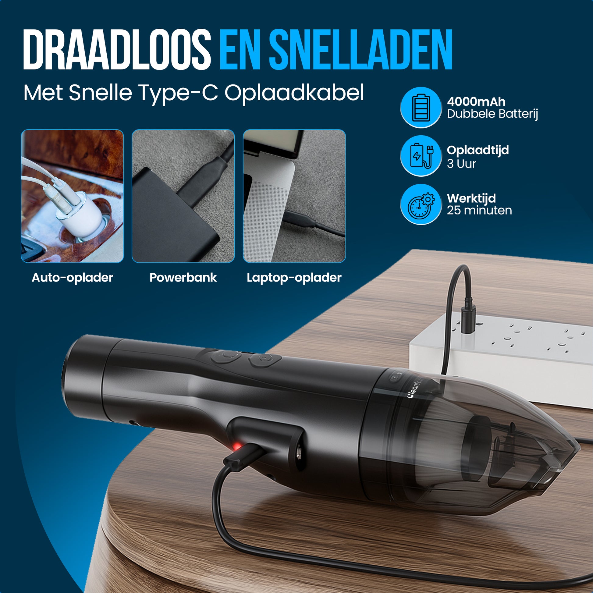 De Cleanforce is volledig draadloos en wordt aangedreven door twee krachtige 2000mAh lithiumbatterijen. Je laadt hem eenvoudig op via USB – thuis, op kantoor of zelfs in de auto met een powerbank. Volledig opgeladen biedt hij tot 18 minuten onafgebroken zuigkracht, meer dan genoeg voor een complete reinigingsbeurt van jouw auto. En dankzij de twee LED-lampjes blijf je altijd op de hoogte van de batterijstatus.