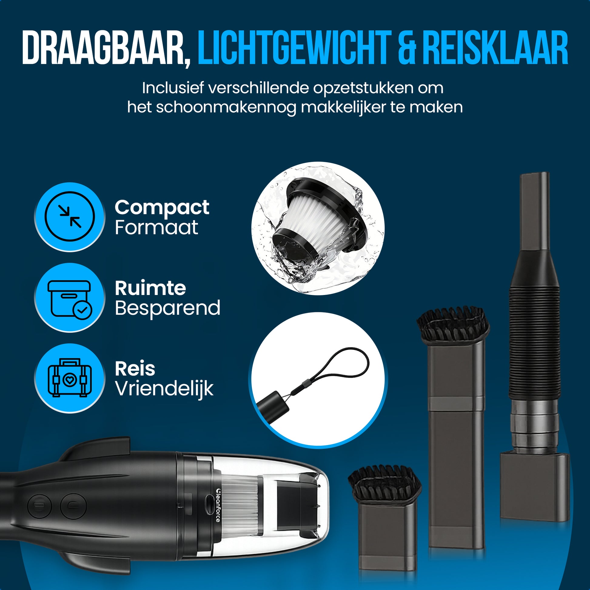 Een nette auto maakt elke rit aangenamer. Of je nu dagelijks onderweg bent of net terugkomt van een weekendje weg: met de Cleanforce houd je het interieur snel en eenvoudig schoon. Geen grote stofzuiger meer uit de kast halen of naar de wasstraat rijden – jij hebt alles zelf in de hand, waar je ook bent.
