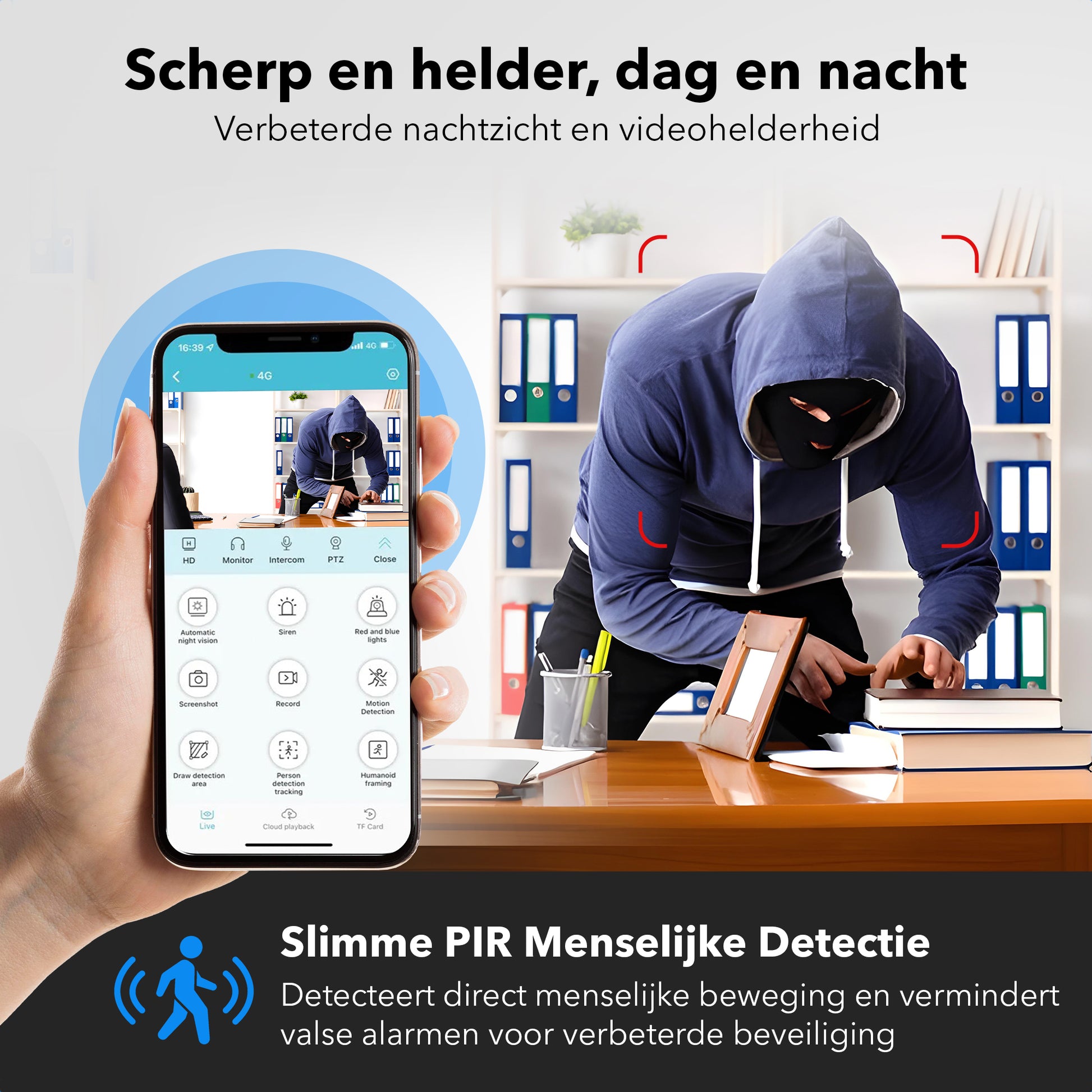 De geavanceerde PIR bewegingssensor detecteert nauwkeurig beweging en vermindert valse meldingen aanzienlijk. Zodra er activiteit wordt waargenomen, start de camera automatisch met opnemen en ontvang je een pushmelding op je telefoon.