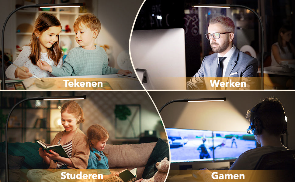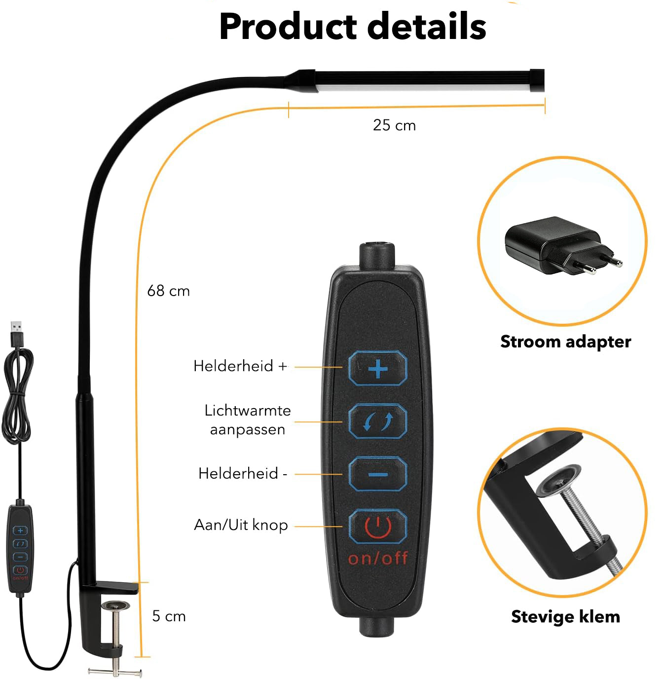 Deze dimbare bureaulamp met klem biedt 3 kleuropties: warm licht (2700K), warm wit licht (4500K) en koel licht (6500K). Elke verlichtingsmodus heeft 10 dimbare helderheidsniveaus, ideaal voor lezen, studeren, ontspannen, werken, nadenken, tekenen, breien, naaien, hobby's en handwerken.