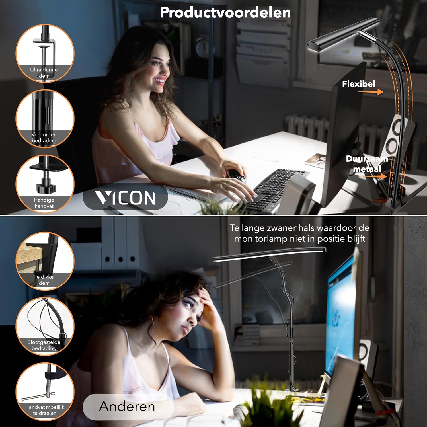 Breng je werkplek of leeshoek naar een hoger niveau met de Vicon LED Bureaulamp. Deze veelzijdige monitorlamp biedt dimbare verlichting, een flexibele 360° verstelbare gooseneck, en een stevige metalen klem voor eenvoudige bevestiging. Dankzij de brede lichtbalk en oogvriendelijke technologie is deze lamp perfect voor werken, lezen, studeren en creatieve hobby’s zoals tekenen, naaien en handwerken.